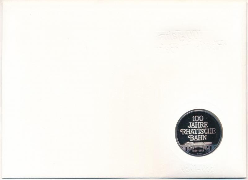 Svájc 1989. "Rhätische Bahn / 100 jahre Rhätische Bahn" jelzett Ag emlékérem, érmés borítékban, bélyeggel, bélyegzéssel T:1- patina