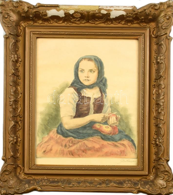 Glatz Oszkár (1862-1958)-Prihoda István (1891-1956): Almát hámozó lány. Színezett rézkarc, papír, jelzett (Glatz Oszkár). Üvegezett, sérült keretben. 36x28 cm