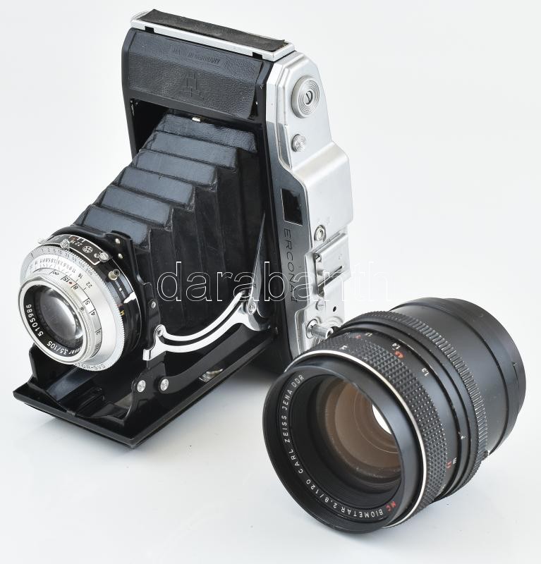 cca 1956 Zeiss Ikon Ercona II összecsukható fényképezőgép, Carl Zeiss Jena Tessar 105 mm f/3,5 objektívvel, Prontor-SVS zárral (ritkább változat), hibás állapotban + Carl Zeiss Jena DDR Biometar 120 mm f/2,8 objektív / Vintage DDR folding camera, in faulty condition + lens