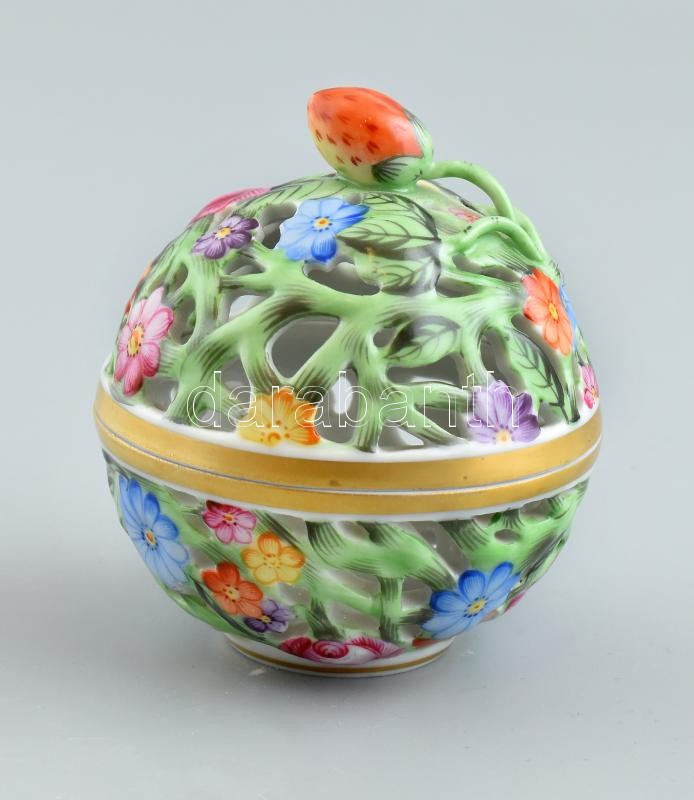 Herendi szamócás áttört bonbonier, kézzel festett, jelzett, apró kopás...