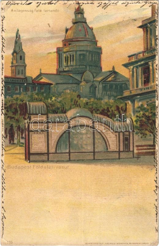 Description: 1899 Budapest V. Untergrundbahn. Gegen das Licht zu halten / Deák tér, Földalatti vasút, Bazilika. Kunstanstalt "Kosmos" No. 175. Világosság felé tartandó lap / hold to light litho (EK)