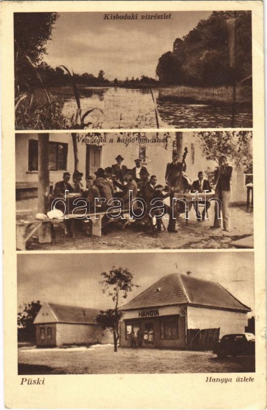 1941 Püski, Kisbodaki víz részlet, vendéglő a hajóállomásnál, cigány muzsikusok, automobil, Hangya szövetkezet üzlete és saját kiadása (EK)