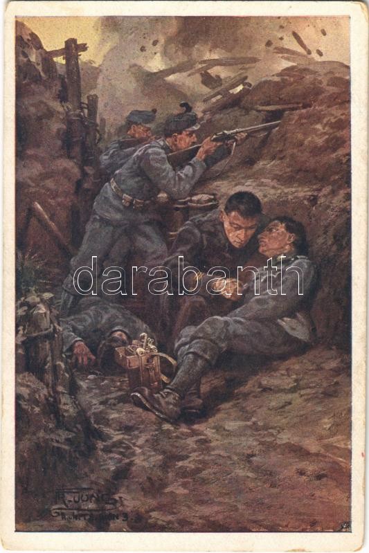 Feldkurat Emil Boscarelli erteilt |ahrend des Kampfes der Landesschützen vom Trientner Regiment, selbts schon schwer verwundet, einem sterbenden Soldaten, nachdem er ihm Samariterdienste geleistet hatte, den letzten geistlichen Zuspruch. Aus dem goldenen Buche der Armee Serie V. Offizielle Karte für Rotes Kreuz, Kriegsfürsorgeamt, Kriegshilfsbüro Nr. 575. / WWI Austro-Hungarian K.u.K. military art postcard s: Fr. Jung (EK)