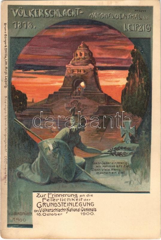 Description: Völkerschlacht-Nationaldenkmal bei Leipzig. Zur Erinnerung an die Feierlichkeit der Grundsteinlegung des Völkerschlacht-National-Denkmals am 18. Oktober 1900 / German military art postcard, national military monument. Bruno Bürger & Ottillie Lith. Anst. Officielle Karte No. 2247. Art Nouveau, litho s: Bergmüller (r)