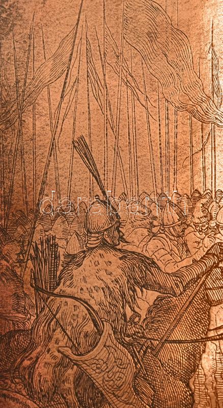 Description: A magyarok bejövetele (Feszty-körkép) részletét ábrázoló réz nyomólemez, 22x14 cm / Copper engraving plate of a detail of Árpád Feszty's famous painting " Arrival of the Hungarians"