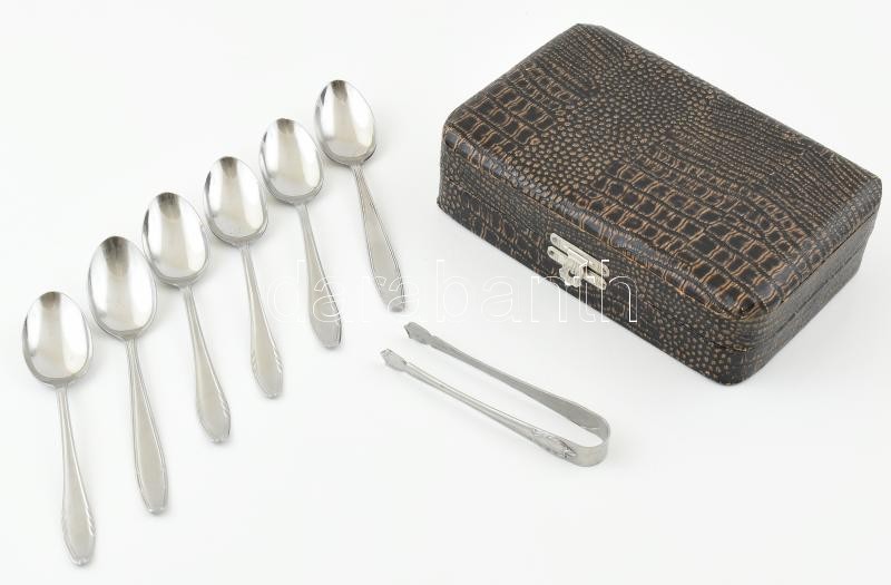 Teás kanál készlet, hat személyes, díszdobozban, hozzá cukorfogó