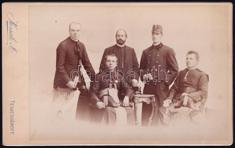 cca 1895 Hemits József a 7. hadtest plébánosa katonákkal, keményhátú fotó Kossak kolozsvári műterméből, 13,5×21 cm