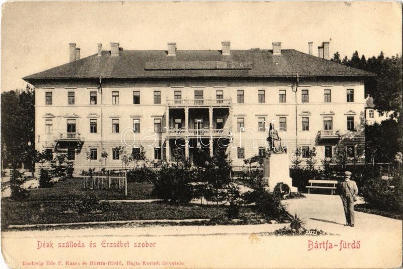 Description: Bártfa, Bártfafürdő, Bardejovské Kúpele, Bardiov, Bardejov; Deák szálloda, Erzsébet királyné (Sisi) szobor, emlékmű. Eschwig Ede F. kiadása. Hajts Kornél felvétele / hotel, Empress Elisabeth of Austria monument, statue (EM)