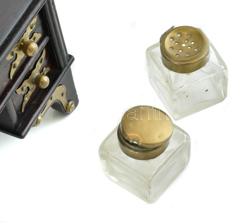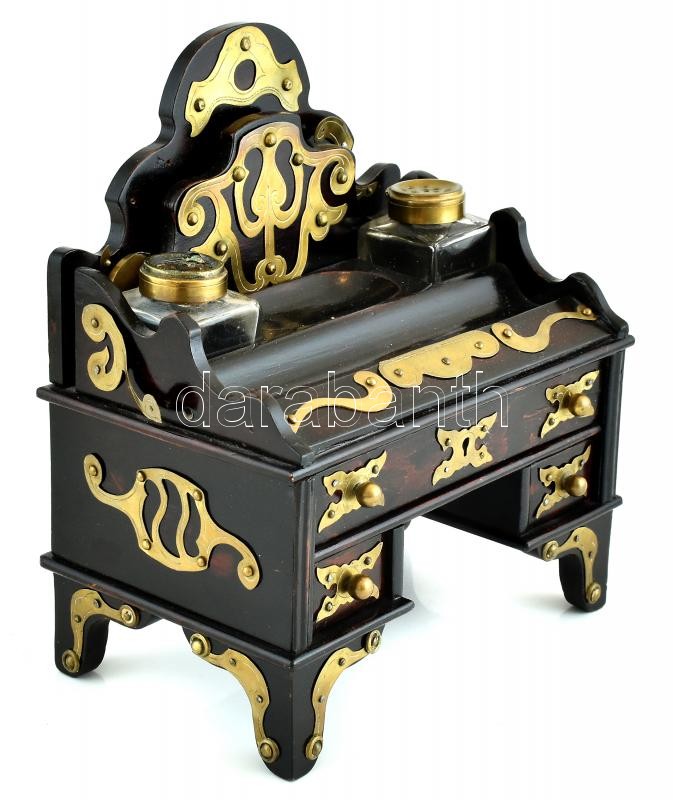 Szecessziós írószekreter formájú kalamáris, fa, réz veretekkel, apró s...