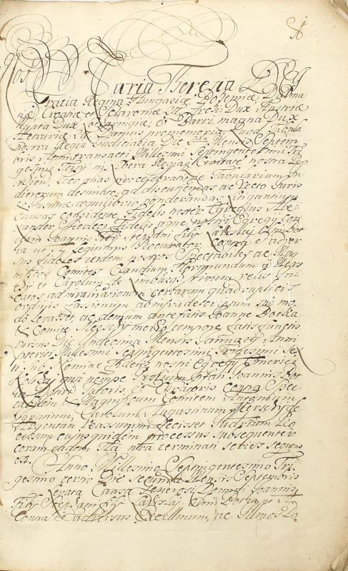 Description: cca 1740 Rumi Lázár Vas vármegyei nemes, szolgabíró részére összeállított másolati gyűjtemény ítélet- és tanúságlevelekről, pl. Mária Terézia oklevele Pest megyei nemesek peres ügyében (1736 után), papír, latin
