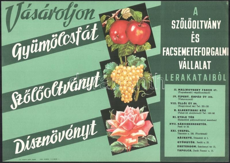 "Vásároljon gyümölcsfát, szőlőoltványt, dísznövényt a Szőlőöltvány és Facsemeteforgalmi Vállalat lerakataiból" villamosplakát, 23,5×33,5 cm