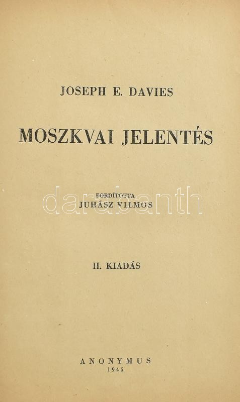 Davies, Joseph E.: Moszkvai jelentés. Ford.: Juhász Vilmos. Bp., 1945, Anonymus, 495 p. Második kiadás. Egészvászon-kötésben, kissé sérült borítóval.