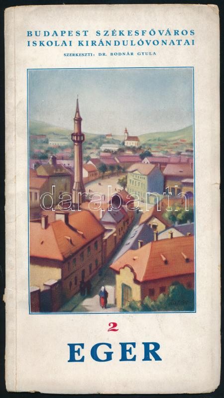 Budapest székesfőváros iskolai kirándulóvonatai 2.: Eger. Szerk.: Dr. Bodnár Gyula. Bp., 1938, Budapest székesfőváros házinyomdája, 16 p. + 3 térkép. Harmadik kiadás. Fekete-fehér képekkel illusztrálva. Kiadói papírkötés, kissé sérült, kopott borítóval.