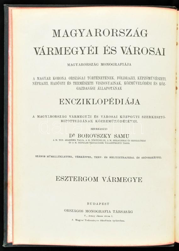 Esztergom vármegye. A Magyarország Vármegyéi és Városai Központi Szerkesztő Bizottságának felügyelete alatt írták az esztergommegyei helyi munkatársak. Magyarország Vármegyéi és Városai. Bp.,[1906], Országos Monografia Társaság, XII+471 p.+1 (kihajtható térkép) t. Gazdag képanyaggal illusztrált. Kiadói aranyozott, festett, illusztrált egészvászon-kötés, foltos hátsó borító, lapok a tűzésnél néhol kijárnak.