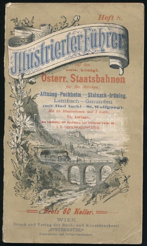 Illustrierter Führer auf den k. k. Österr. Staatsbahnen für die Strecken Attnang-Puchheim - Stainach-Irdning, Lambach - Gmunden und der Salzkammergut-Lokalbahn Bad Ischl - St. Wolfgang. Heft 8. VI. Auflage. H.n., é.n. (cca 1910), Buch- und Kunstdruckerei "Steyrermühl", 120 p. + 1 t (színes képtábla) + 1 térkép. Számos szövegközi, fekete-fehér képpel illusztrálva. Német nyelven. Kiadói papírkötés, kissé sérült borítóval.