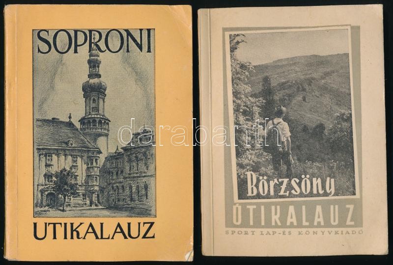 Soproni útikalauz. Szerk.: Gimes Endre. Sopron, 1960., Győr-Sopron M. Tanácsának Idegenforgalmi Hivatala. Kiadói papírkötés, a lapok sarkain szamárfüllel. + Börzsöny útikalauz. Szerk.: Lajos Ferenc. Bp., 1956., Sport. Térkép-melléklettel. Kiadói papírkötés.