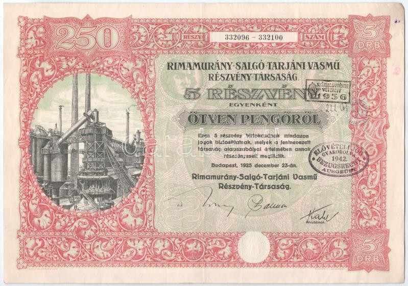 Budapest 1925. "Rimamurány-Salgó-Tarjáni Vasmű Részvény-Társaság&... https://www.darabanth.com/en/405-Online-auction/405.0/Numismatics/Shares-and-Tickets~1500005/Budapest-1925-Rimamurany-Salgo-Tarjani-Vasmu-Reszveny-Tarsasag-ot-reszvenye-egyenkent~II2379236