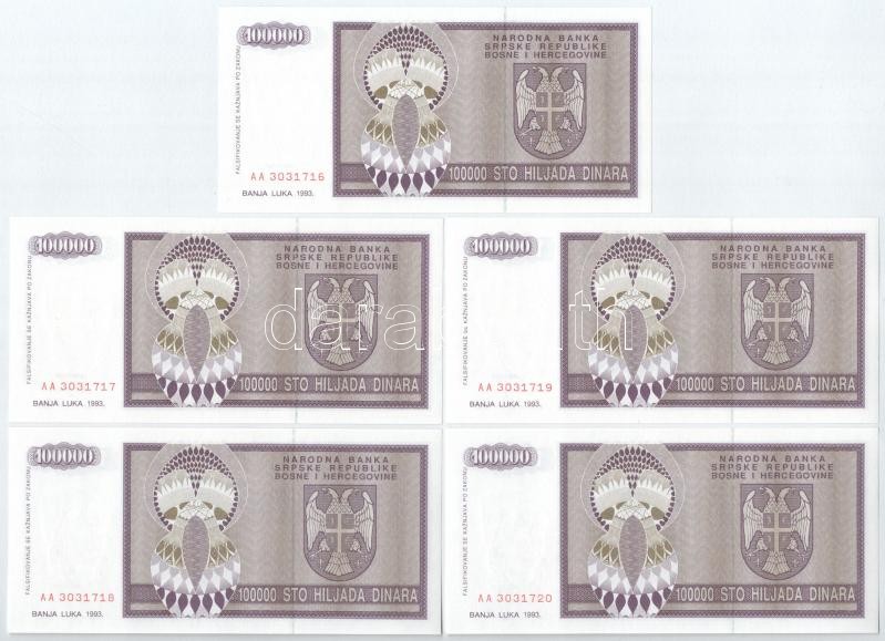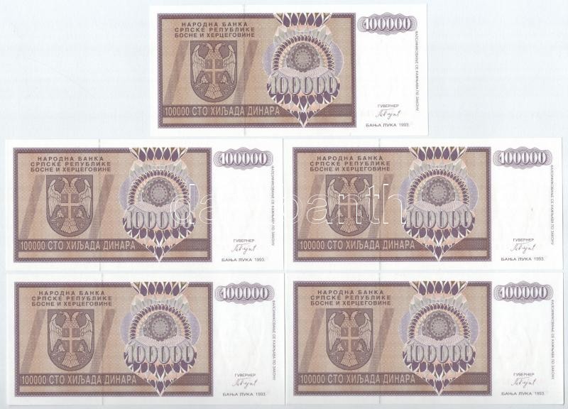 Bosnia and Hercegovina / Serbian Republic / Banja Luka 1993. 100.000 Dinara (5x) consecutive serials C:UNC