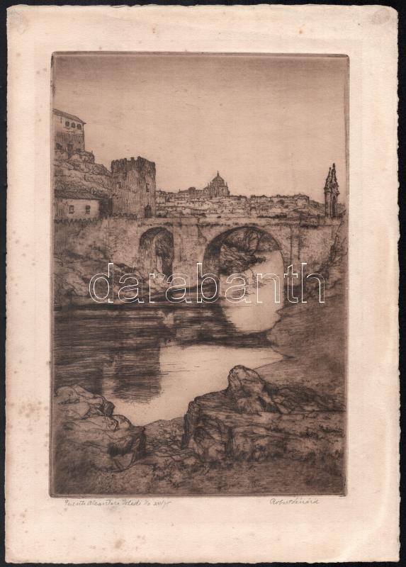 Description: Lénárd Lévy Róbert (1879-1936): Puente de Alcántara (Toledo). Rézkarc, papír. Jelzett. Számozott: 24/75. Lap széle kissé foltos. 29,5x20 cm / Róbert Lénárd Lévy (1879-1936): Puente de Alcántara (Toledo). Etching on paper. Signed. Numbered: 24/75. A bit spotty on the edges. 29,5x20 cm