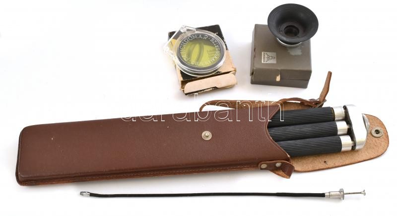 Praktica Nova IB fénykézgép tokjában, Carl Zeiss Tessar 50mm f2.8 m42-es objektívvel, sárga szűrővel, szemkagylóval, kioldó kábellel, állvánnyal tokjában