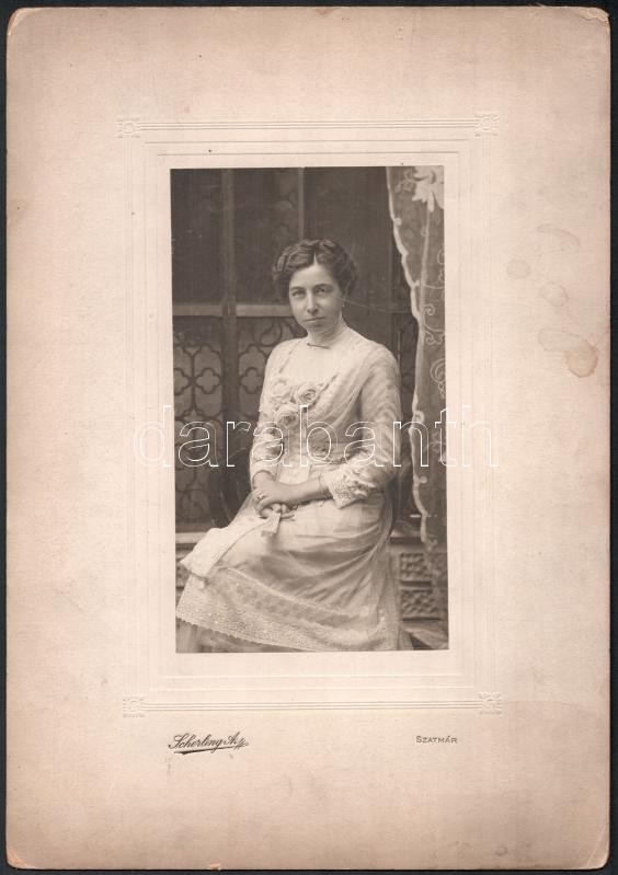 cca 1910 Hölgyportré, kartonra kasírozott fotó Scherling szatmári műte...