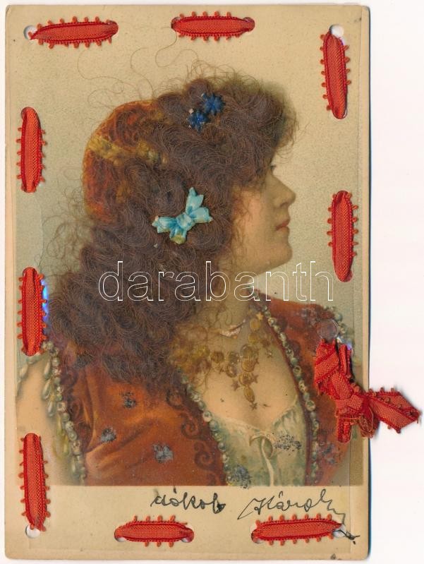 1900 Hölgy igazi hajas rátéttel, szalaggal / Lady with real hair and ribbon. litho