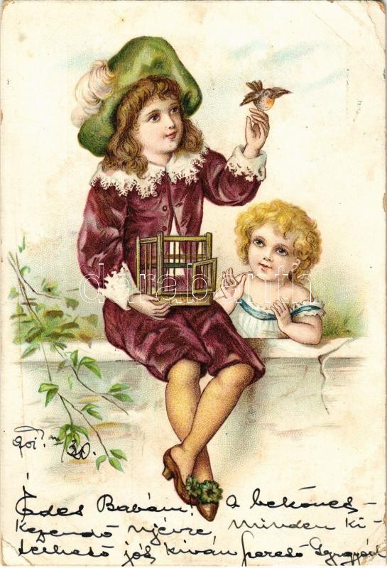 1901 Children with bird. litho (vágott / cut)