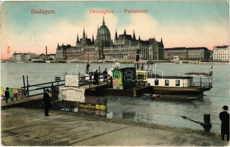 1908 Budapest V. Országház, Parlament, hajóállomás, Lánchíd ingahajó "Császárfürdői jeggyel" Taussig A. 8704. (EK)