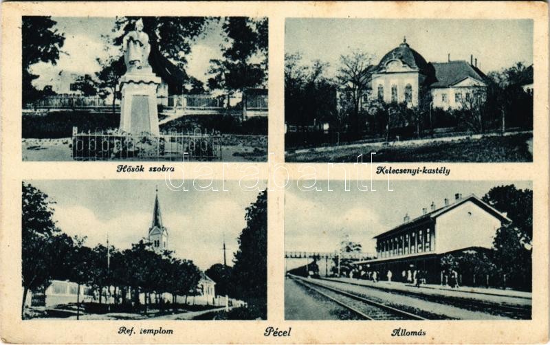 1942 Pécel, Hősök szobra, Kelecsenyi kastély, református templom, vasútállomás