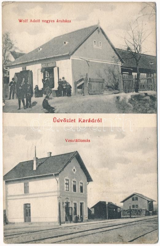 Kárád (Fonyód), Wolf Adolf vegyesáruház üzlete és saját kiadása, vasútállomás (EK)