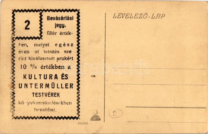 Description: Szentes, Központi takaréképület, takarékpénztár, Hoffmann Jakab és Nagy Ferenc üzlete, Központi szálloda. Hátoldalon Bevásárlási jegy 10% értékben a Kultura és Untermüller Testvérek könyvkerekesékben