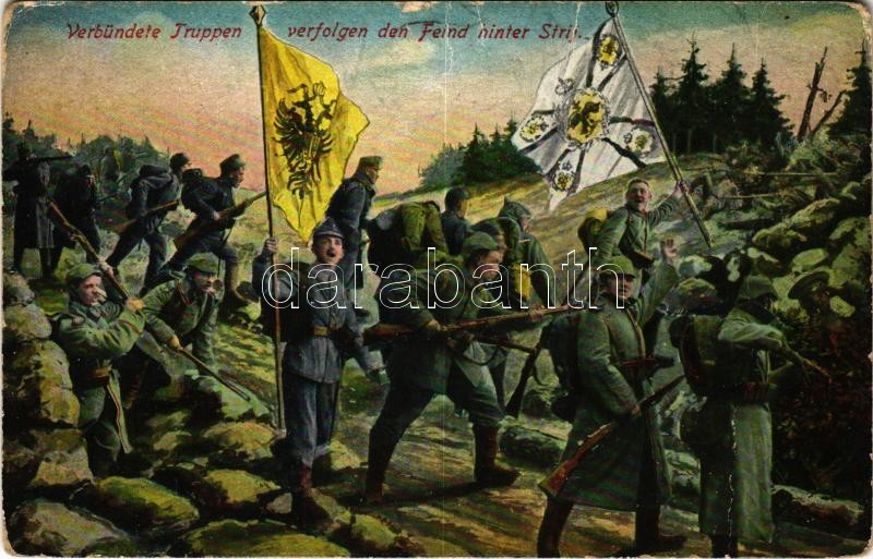 Description: 1916 Verbündete Truppen verfolgen den Feind hinter Stryj / WWI German and Austro-Hungarian K.u.K. military, Viribus Unitis propaganda + "M. kir. 1. honvéd lovas tüzér osztály parancsnokság" (fa)