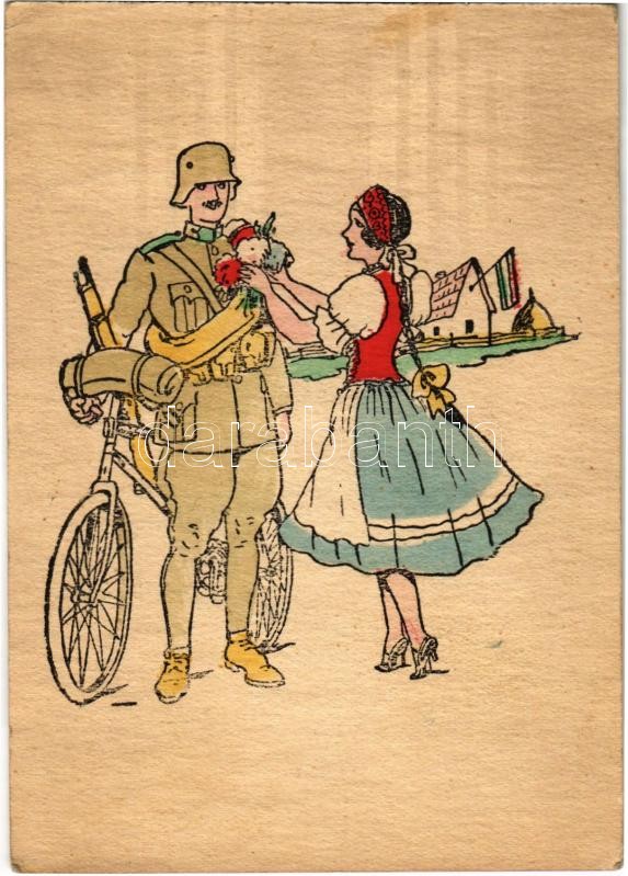 Description: Bevonulás. Kiadja a DEFHE (Délvidéki Egyetemi és Főiskolai Hallgatók Egyesülete) Aradi Temesi Bánság / WWII Hungarian military art postcard, entry of the Hungarian troops, irredenta propaganda (EK)