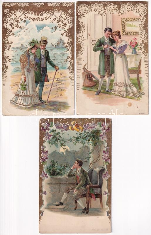 3 db RÉGI (1905 előtti) szecessziós litho motívum képeslap: romantikus párok / 3 pre-1905 Art Nouveau litho motive postcards: romantic couples