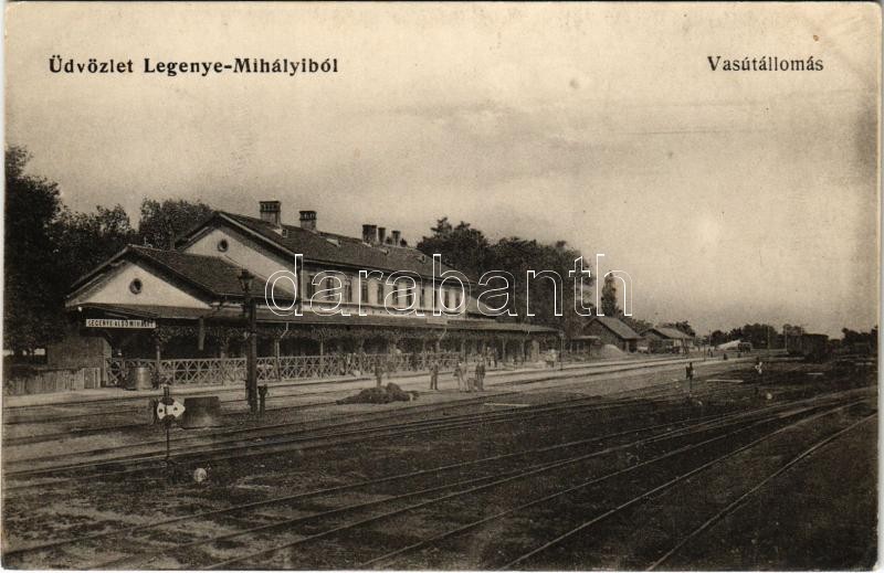 1915 Legenye-Alsómihályi, Legenye-Mihályi, Luhyna-Michalany (Legina-Mihalány); vasútállomás. Özv. Sochor Jánosné kiadása / Bahnhof / railway station + P.U. bélyegzés
