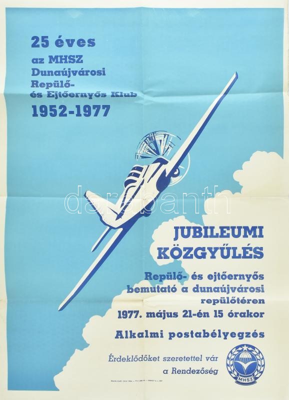 1977 25 éves az MHSZ Dunaújvárosi Repülő- és Ejtőernyős Klub 1952-1977... https://www.darabanth.com/en/406-Online-auction/406.0/Art-and-other-collectibles/Posters~2500003/1977-25-eves-az-MHSZ-Dunaujvarosi-Repulo-es-Ejtoernyos-Klub-1952-1977-jubileumi-kozgyulC3~II2509124