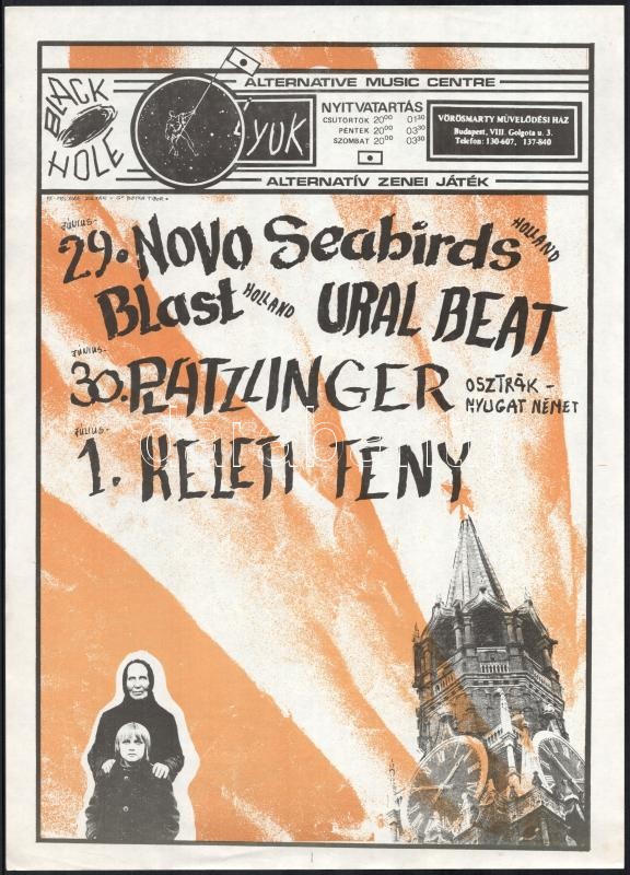 Description: 1989 A budapesti "Fekete Lyuk" alternatív underground zenei klub műsorismertető plakátja, a Keleti Fény és holland-német együttesek fellépésével, Botka Tibor grafikája, kiváló állapotban, 41×29,5 cm