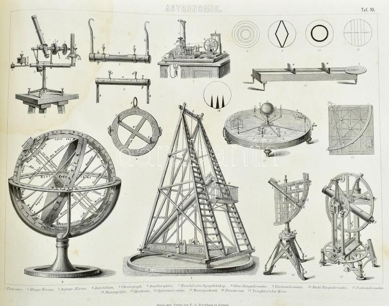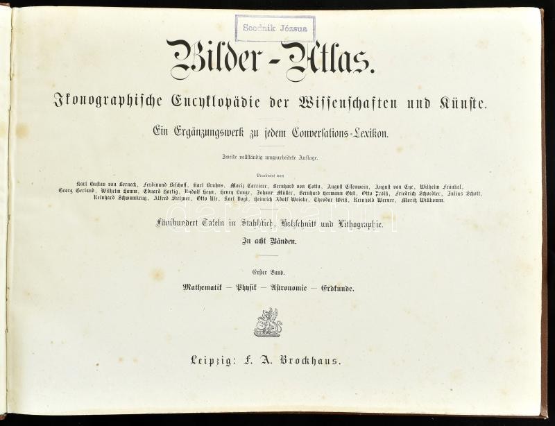Bilder-Atlas. Ikonographische Encyklopädie der Wissenschaften und Künste. Ein Ergänzungswerk zu jedem Conversations-Lexikon. Erster Band: Mathematik - Physik - Astronomie - Erdkunde. Bearbeitet von Karl Gustav von Bernek, Ferdinand Bischoff, et allii. Leipzig,é.n. (cca 1870),F. A. Brockhaus, 5 t +10 t.+12 t.+16 t. (Összesen 43 (fametszetű, acélmetszetű és litografált táblák) t.) Zweite vollständing umgearbeitete Auflage. Hiánytalan táblákkal. Német nyelven. Kiadói aranyozott, festett haránt-alakú egészvászon-kötés, kopott, foltos borítóval, kissé foltos lapokkal, névbélyegzővel.
