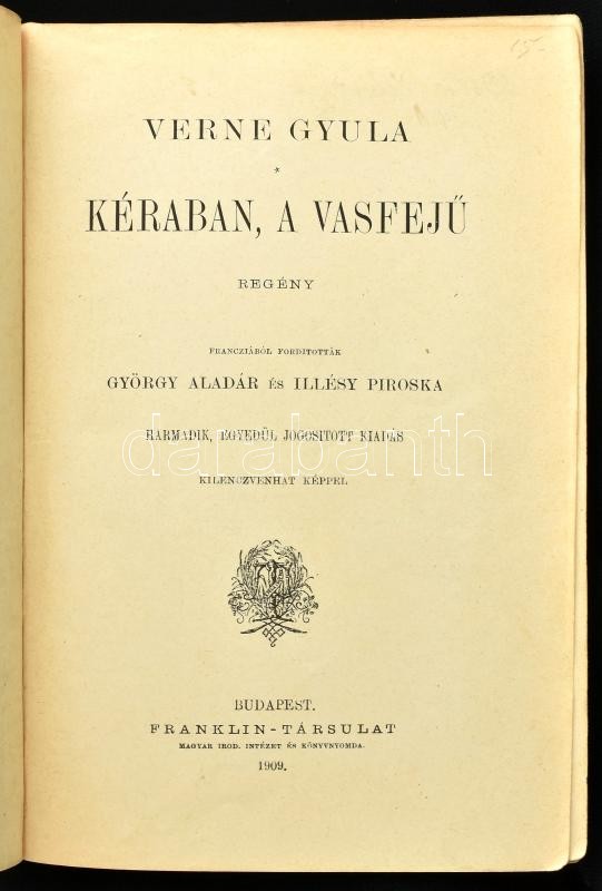 Verne Gyula: Kéraban, a vasfejű. Ford.: György Aladár és Illésy Piroska. Bp.,1909, Franklin, 479 p. Harmadik kiadás. Fekete-fehér egészoldalas illusztrációkkal. Kiadói aranyozott,illusztrált, festett egészvászon sorozatkötésben, kopott borÃtóval, kopott, kissé deformált gerinccel.