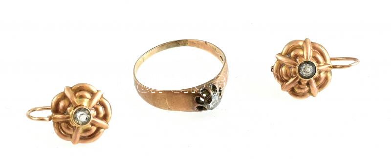 14k arany (Au) fülbevaló párban + gyűrű m: 62. mesterséges kövekkel, ö...