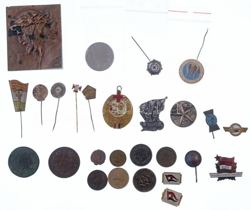 Kis zacskónyi vegyes jelvény, kitűző, plakett és érme tétel, közte Jézus Krisztust ábrázoló öntött bronz plakett T:vegyes