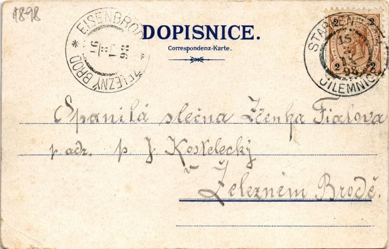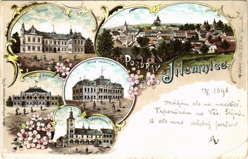 1898 Jilemnice, Zámek, Nová radnice, Sokolna, Stará radnice / castle, new town hall, Sokol house, old town hall. Lit. Th. Böhm. Art Nouveau, floral, litho (EB)