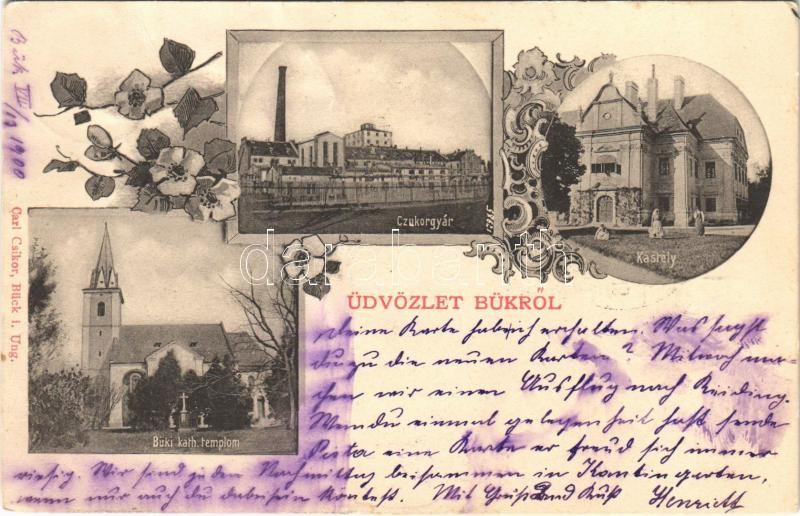 1900 Bük, Bück i. Ung.; Cukorgyár, kastély, Római katolikus templom. Carl Csikor kiadása. Art Nouveau, floral (Rb)