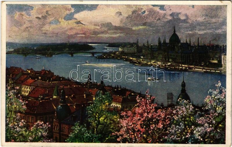 1917 Budapest I. Kilátás az Országház felé. Művészlevelezőlap Hausner ...