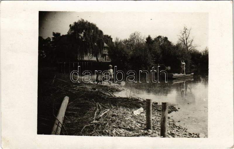 1930 Rábagyarmat, Rába parti ház, csónak, gyerek kutyával. photo