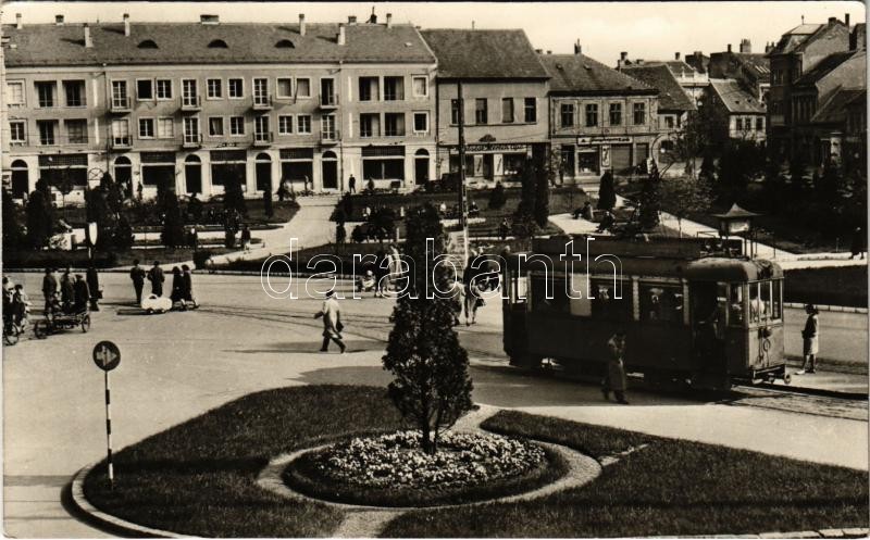 ~1960 Szombathely, tér, villamos, üzletek. Képzőművészeti Alap