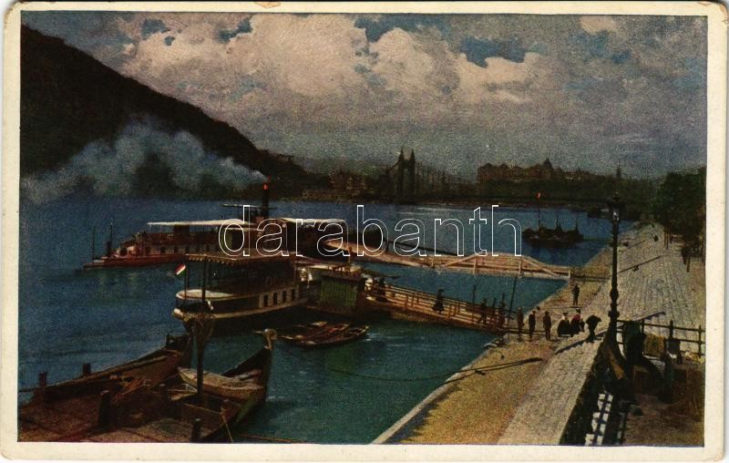 Budapest, Erzsébet híd, pesti rakpart, gőzhajó. Művészlevelezőlap Hausner H. 7014/9. (EM)