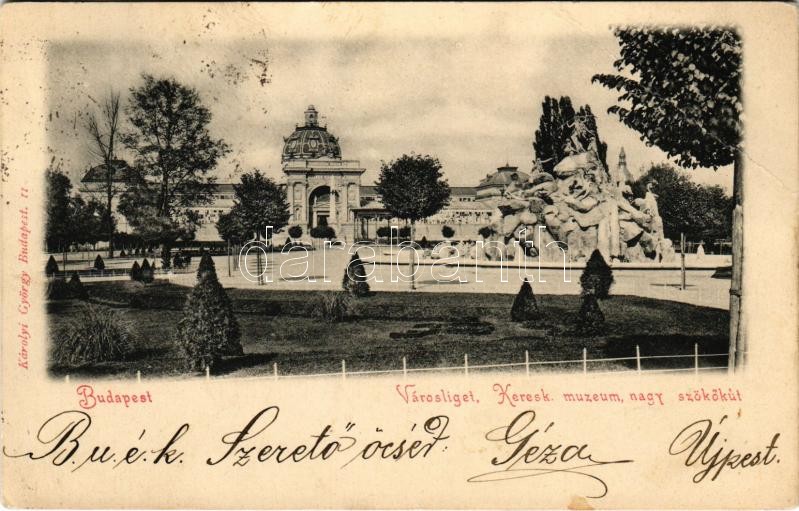 Budapest XIV. Városliget, Kereskedelmi Múzeum, nagy szökőkút. Károlyi György kiadása (EB)