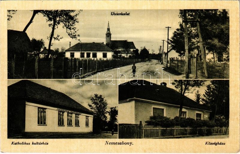 1943 Nagyabony, Nemesabony, Velke Blahovo; utca, Katolikus kultúrház, községháza / street, cultural house, town hall + "NEMESABONY POSTAI ÜGYN"