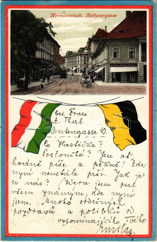 Description: 1916 Nagyszeben, Hermannstadt, Sibiu; Disznódi utca, Julius Wermescher üzlete. Magyar és Habsburg zászlók / Heltauergasse / street, shop. Hungarian and Habsburg flags
